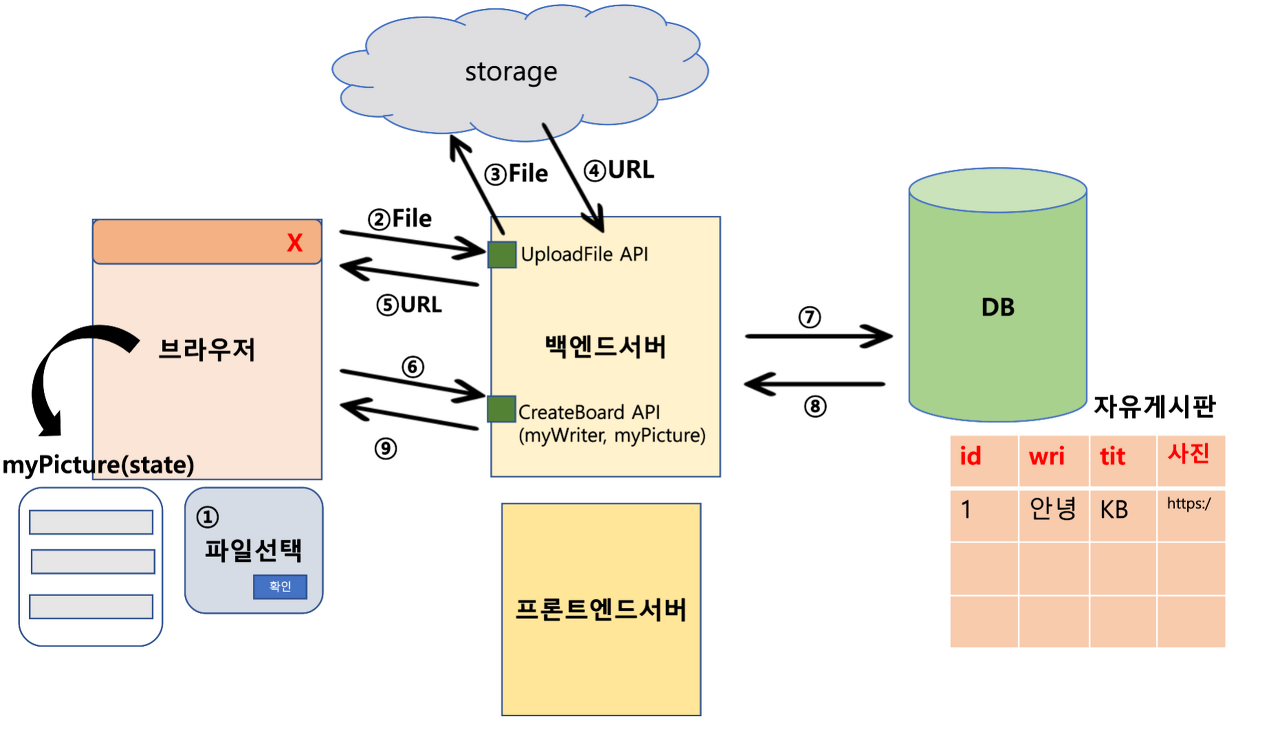 - 프론트엔드에서 작성된 데이터들을 백엔드 createBoard API에 요청을 보낸다. 이 때, [ex: myPicture(state), myWriter, myContents] 내용들이 백엔드쪽으로 받아와진다.